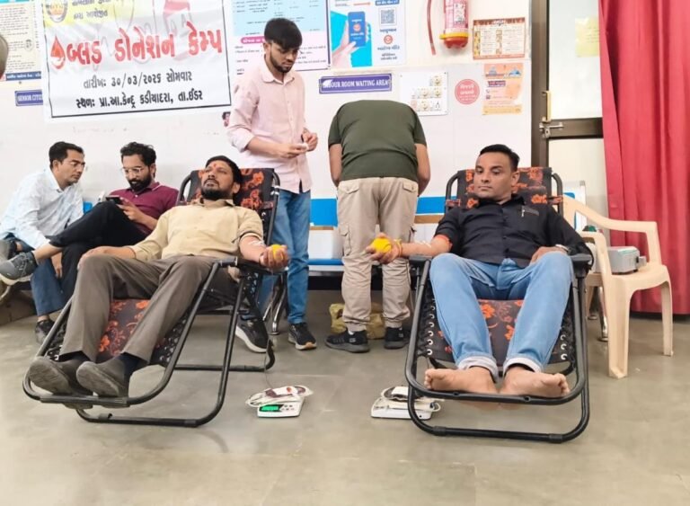સાબરકાંઠા જિલ્લામાં કડિયાદરા પ્રાથમિક આરોગ્ય કેન્દ્ર ખાતે રક્તદાન કેમ્પ યોજાયો હતો. માનવતા, કરુણા અને સમૂહિક જવાબદારીના ઉમદા આશયથી મેડિકલ અધિકારી, સ્ટાફ, આશા બહેનો તથા ગ્રામજનો દ્વારા રક્તદાન થકી કુલ 18 યુનિટ રક્ત એકત્રિત કરાયું હતું. સરકારશ્રી દ્વારા જિલ્લાના ગ્રામ્ય વિસ્તારમાં ચાલી રહેલા રક્તદાન અભિયાનને સક્રિય સહકાર આપવા બદલ તમામ દાતાઓને મુખ્ય જિલ્લા આરોગ્ય અધિકારીશ્રી ડૉ….